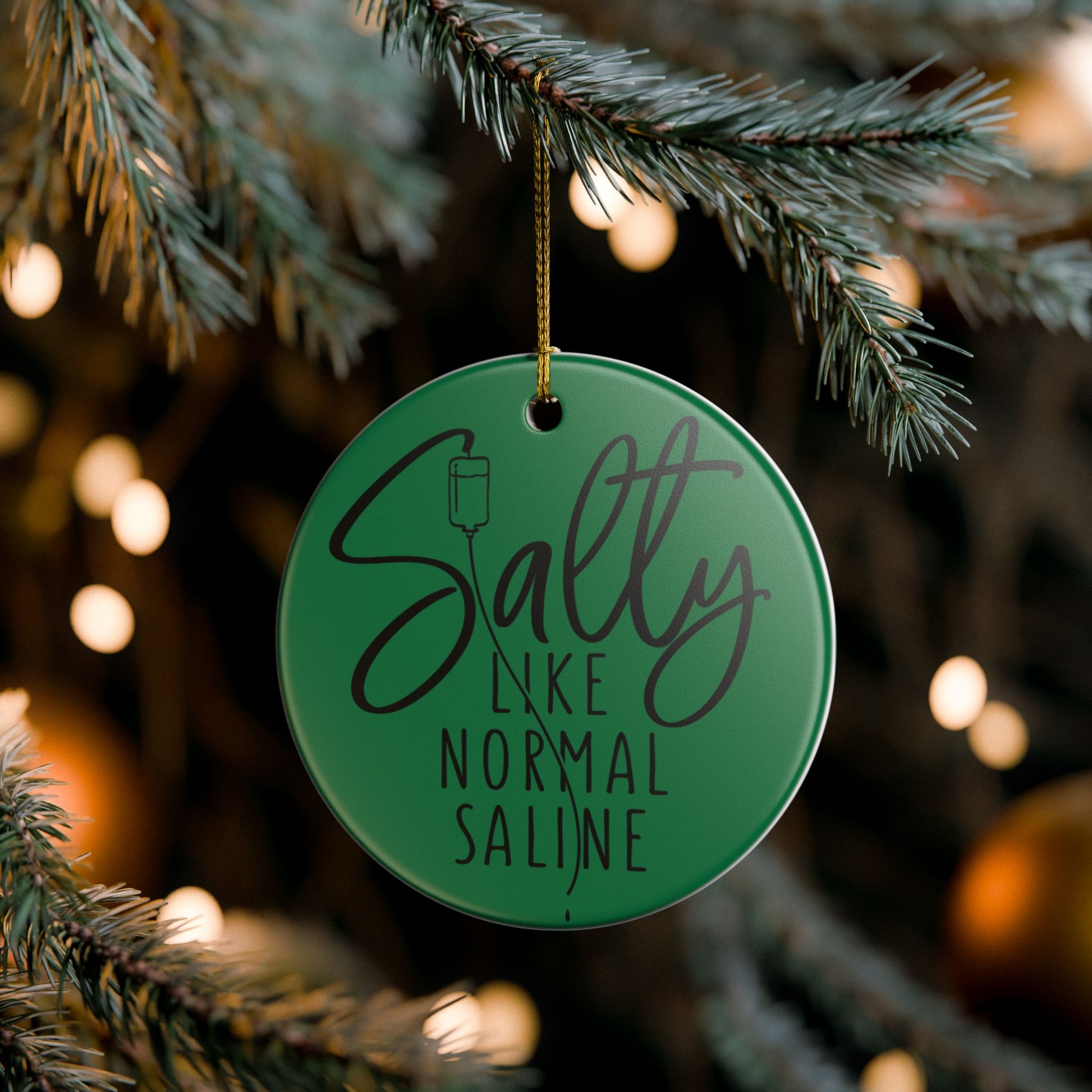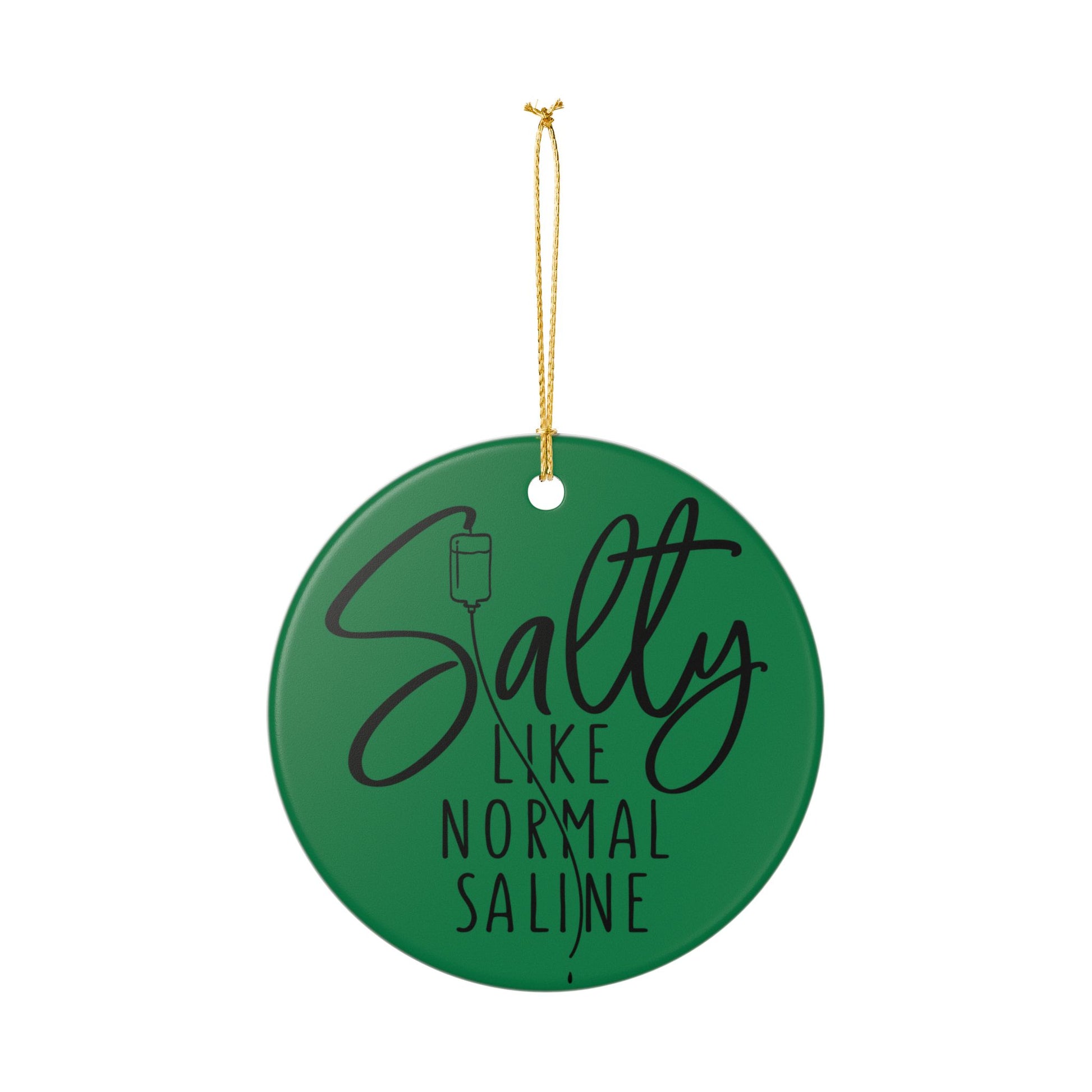 Introducing a charming Ceramic Decoration Ornament that adds a touch of whimsy to your holiday decor. Made from 100% durable ceramic, this glossy ornament features a playful design that reads 'Salty Like Normal Saline', making it a perfect conversation starter. The golden string attached enhances its elegance, allowing you to hang it easily on your tree, or anywhere in your home. Ideal for medical professionals, nursing students, or anyone who appreciates a clever pun, this ornament makes a thoughtful gift for holidays like Christmas, Thanksgiving, or even as a quirky addition to your home year-round. Celebrate life with humor and style!